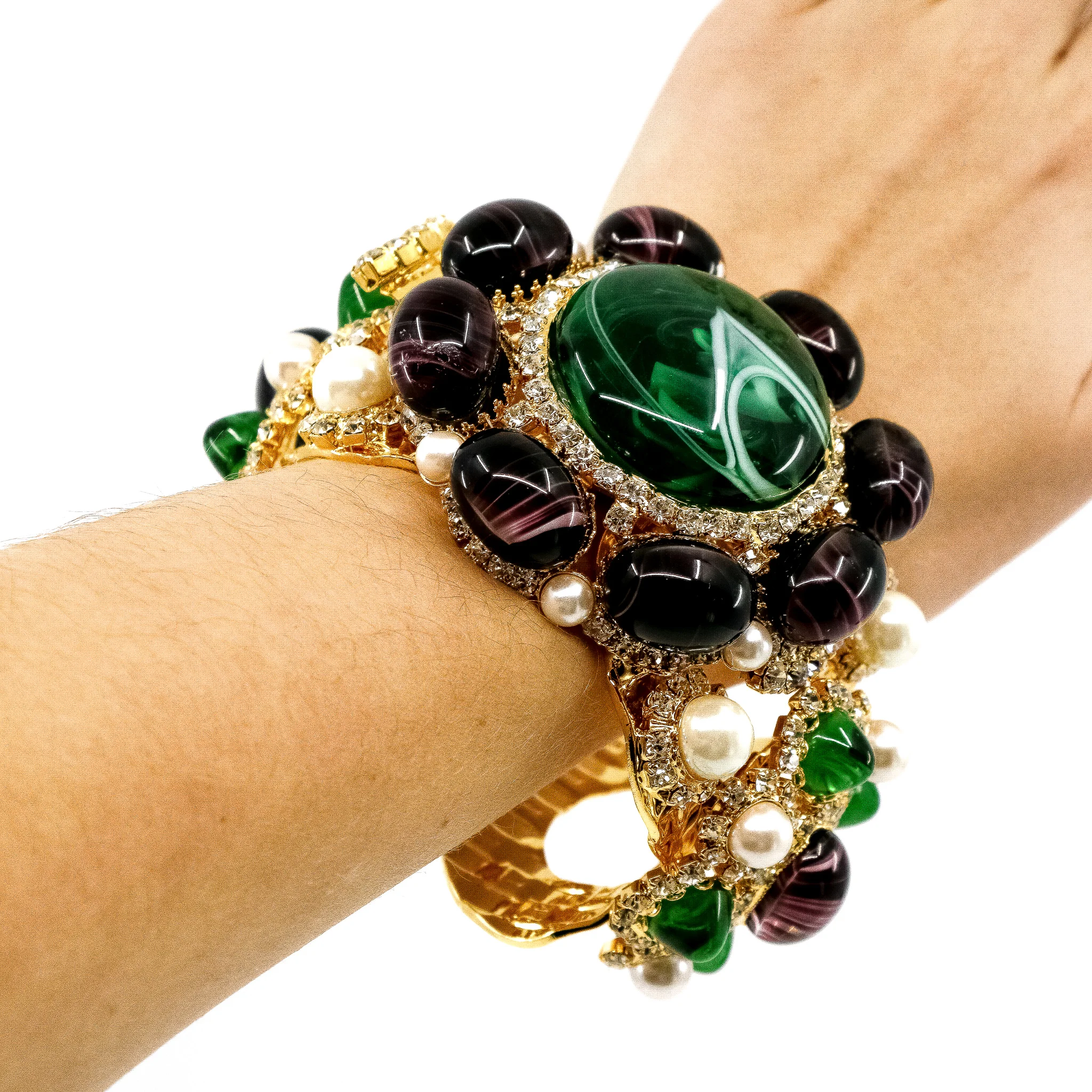 Brand jewelry allow of a yellow gold tone. An array of natural stones is used: emeralds, amethysts, pearls, diamonds and malachite!