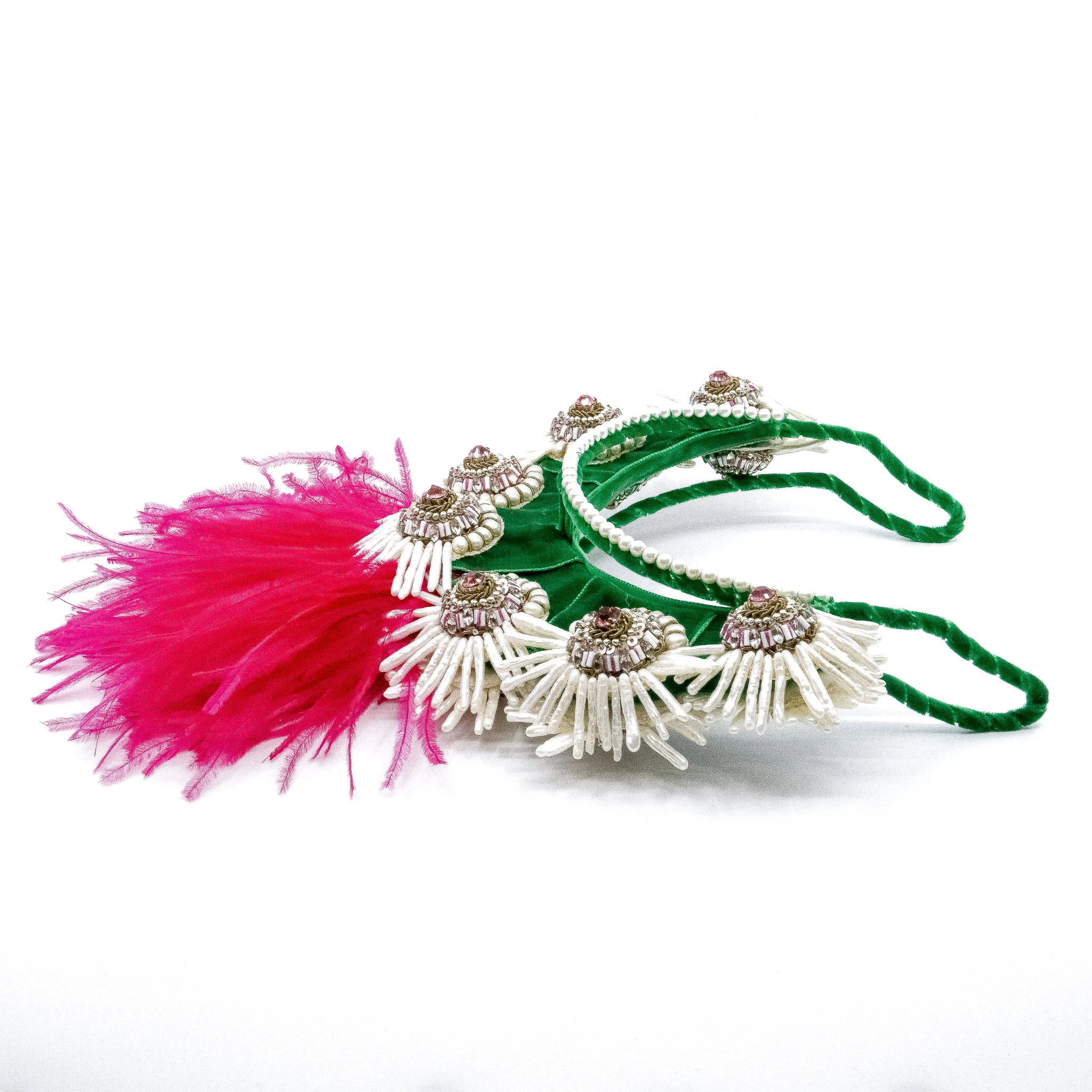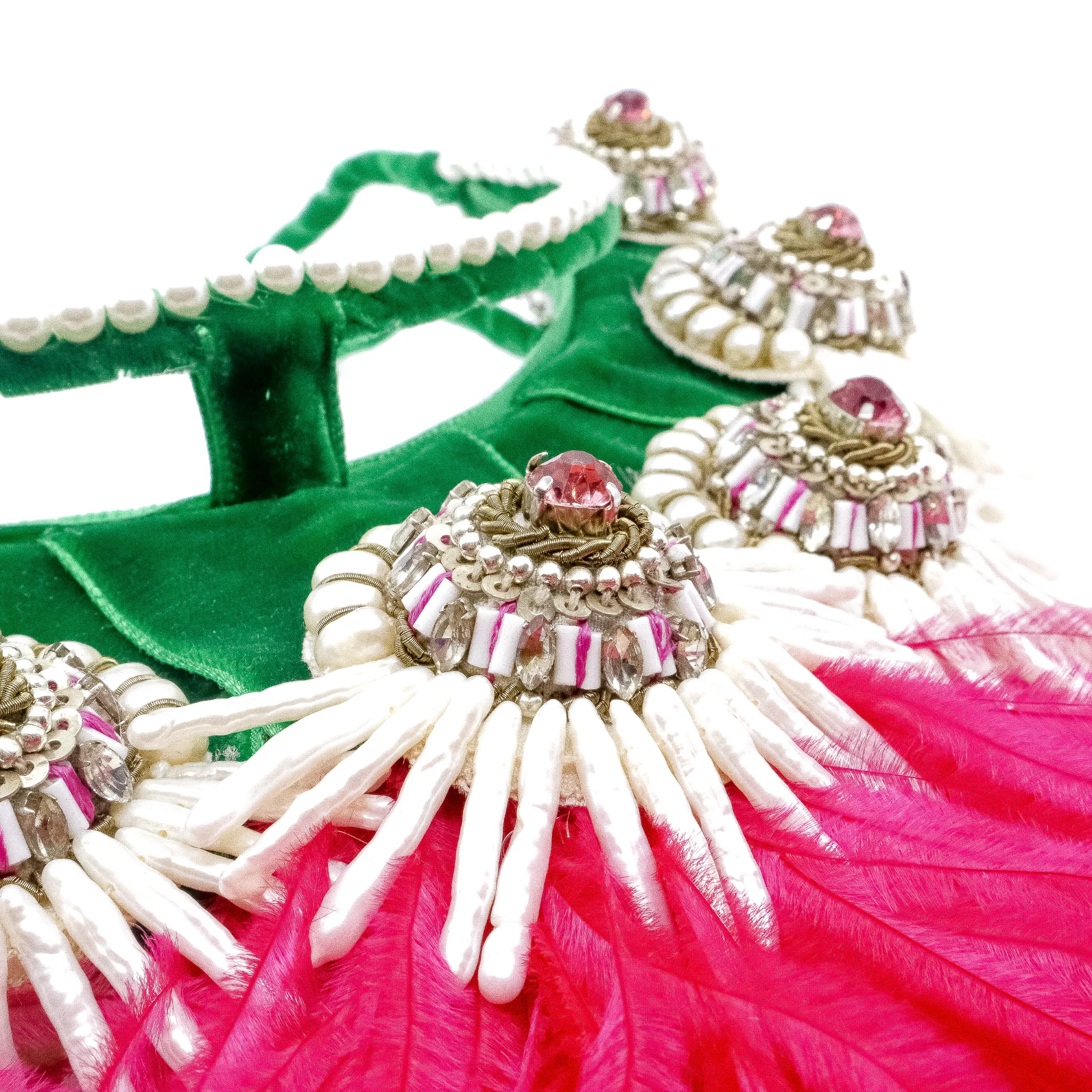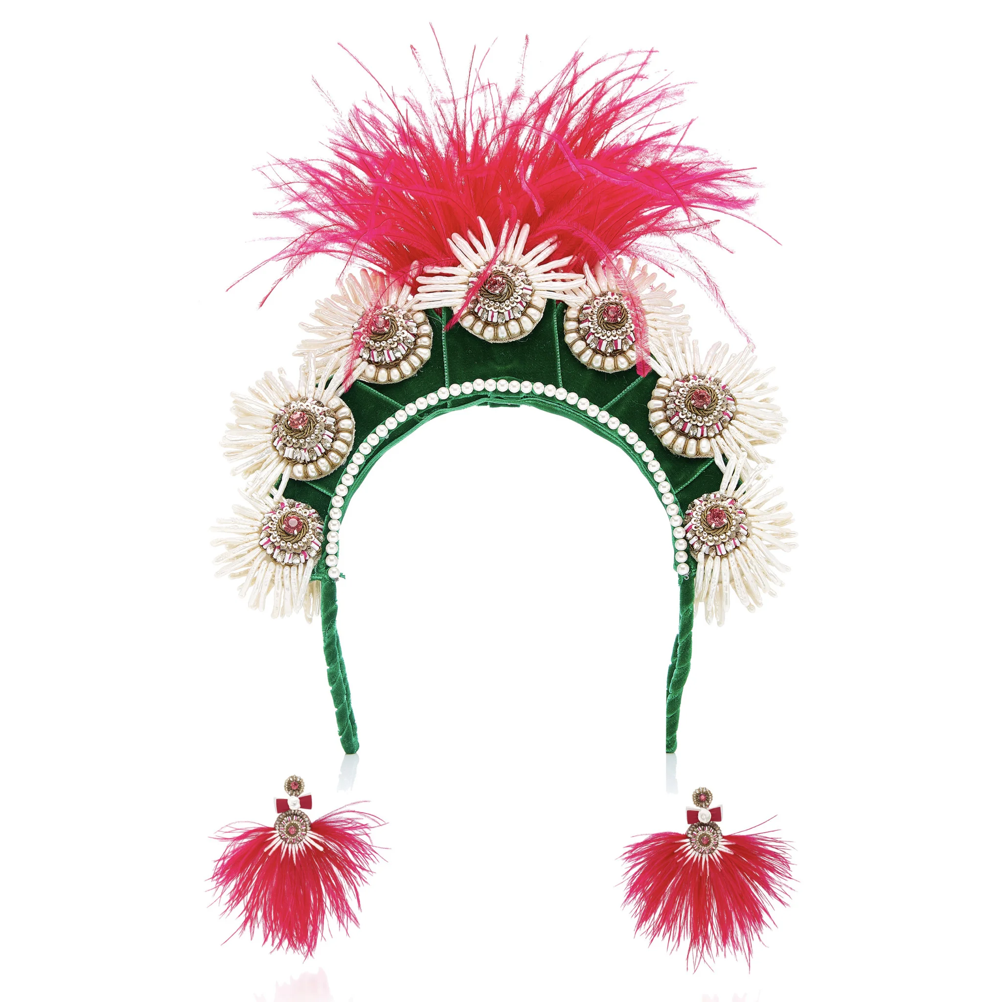 Ranjana Khan’s jewellery features exquisite tradition of her native Indian embroidery combined with an array of unusual materials to create each exceptional piece. These pink Quetzal Feather headpiece features vibrant ostrich features and crystal with pearl details along the earring drops.