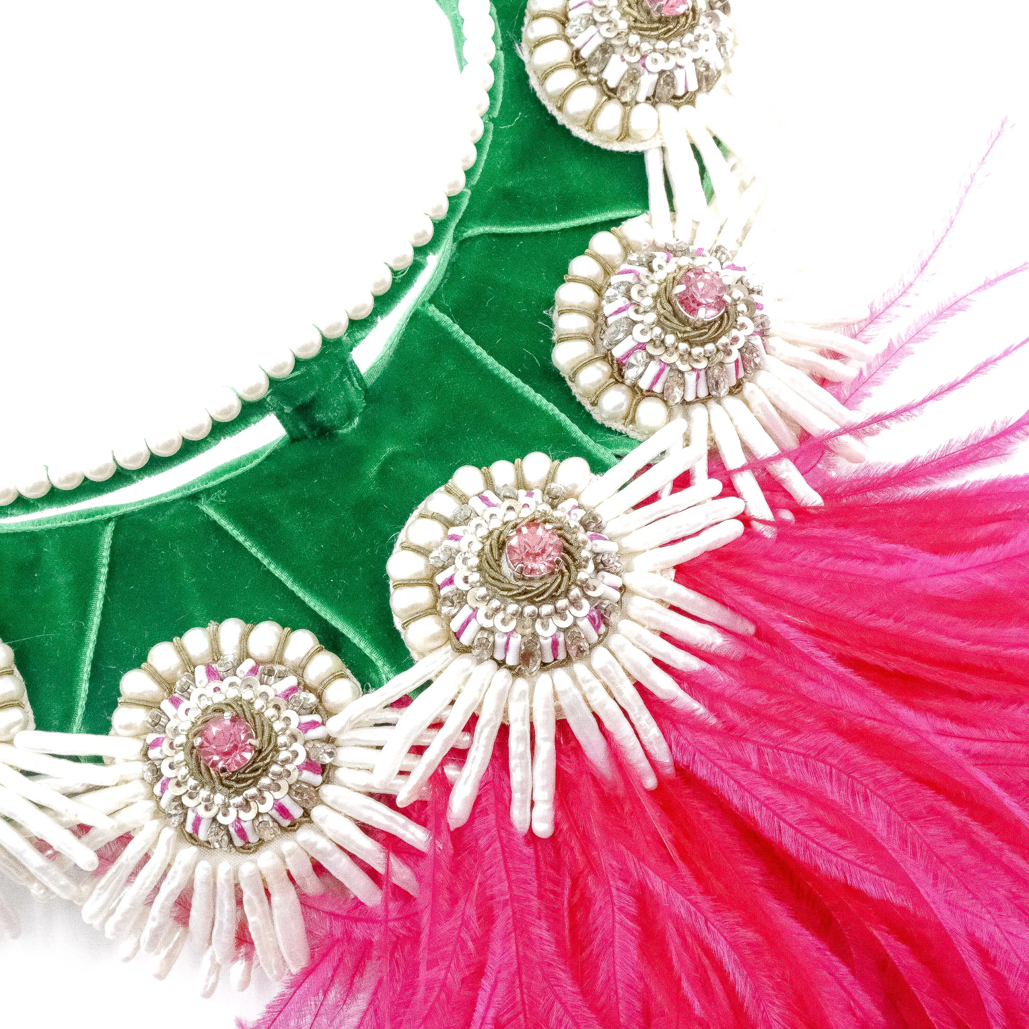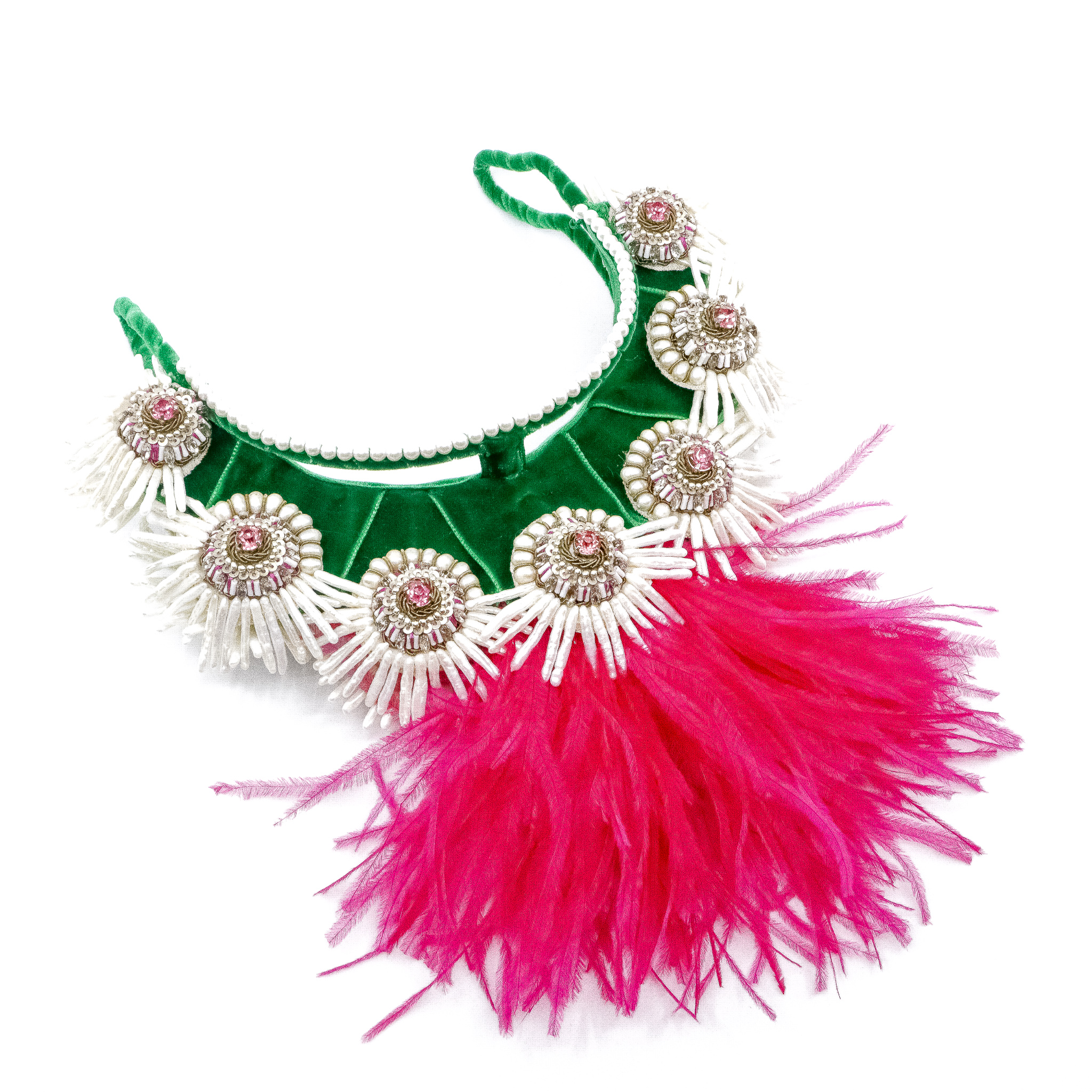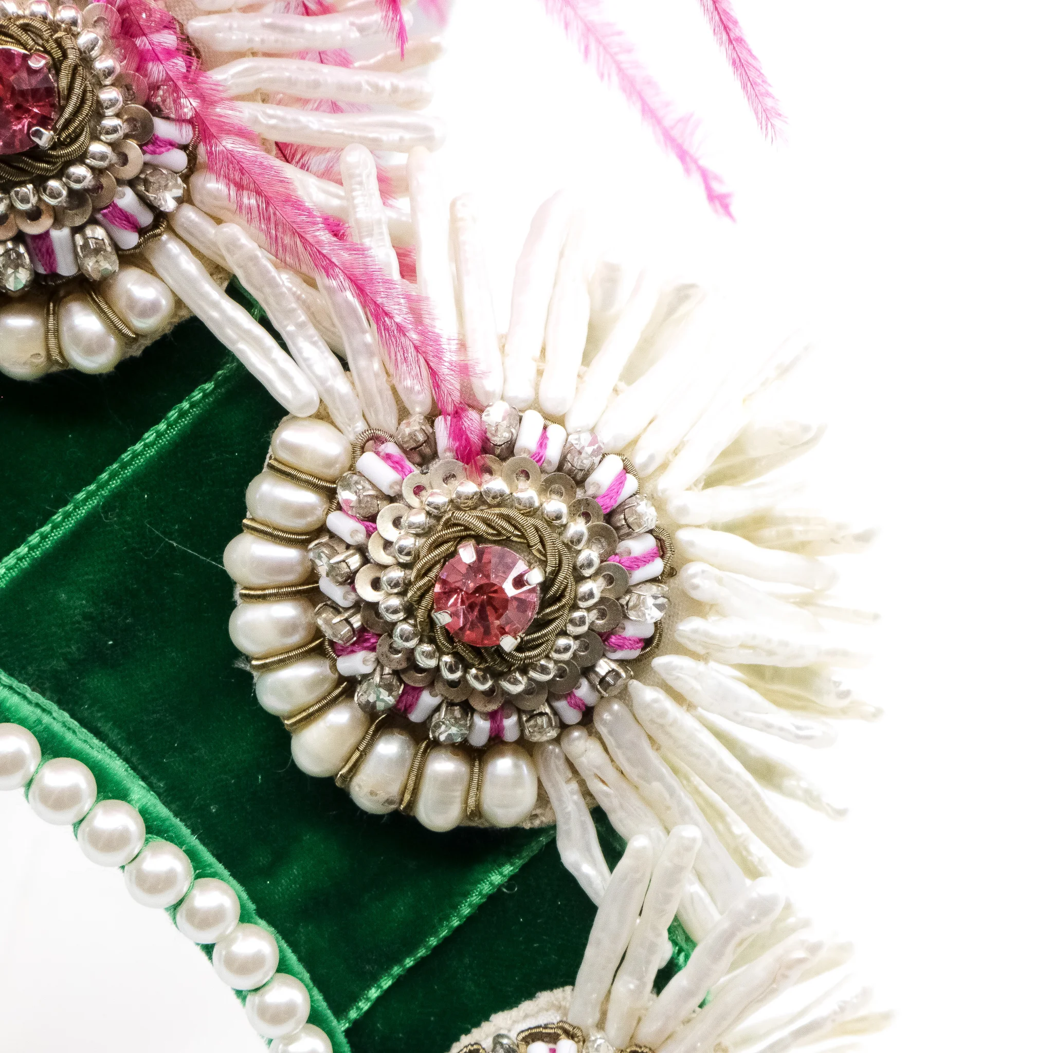 Ranjana Khan’s jewellery features exquisite tradition of her native Indian embroidery combined with an array of unusual materials to create each exceptional piece. These pink Quetzal Feather headpiece features vibrant ostrich features and crystal with pearl details along the earring drops.
