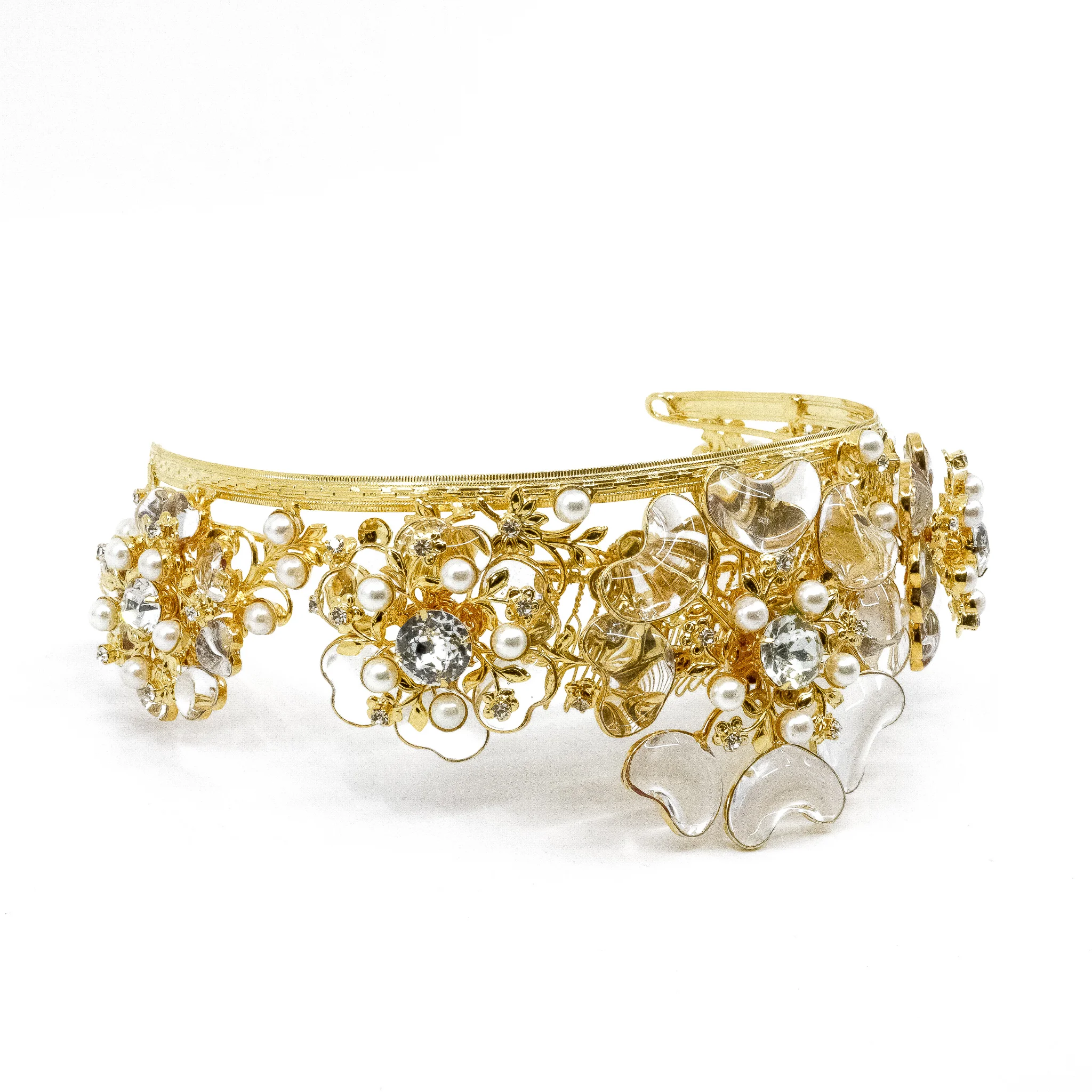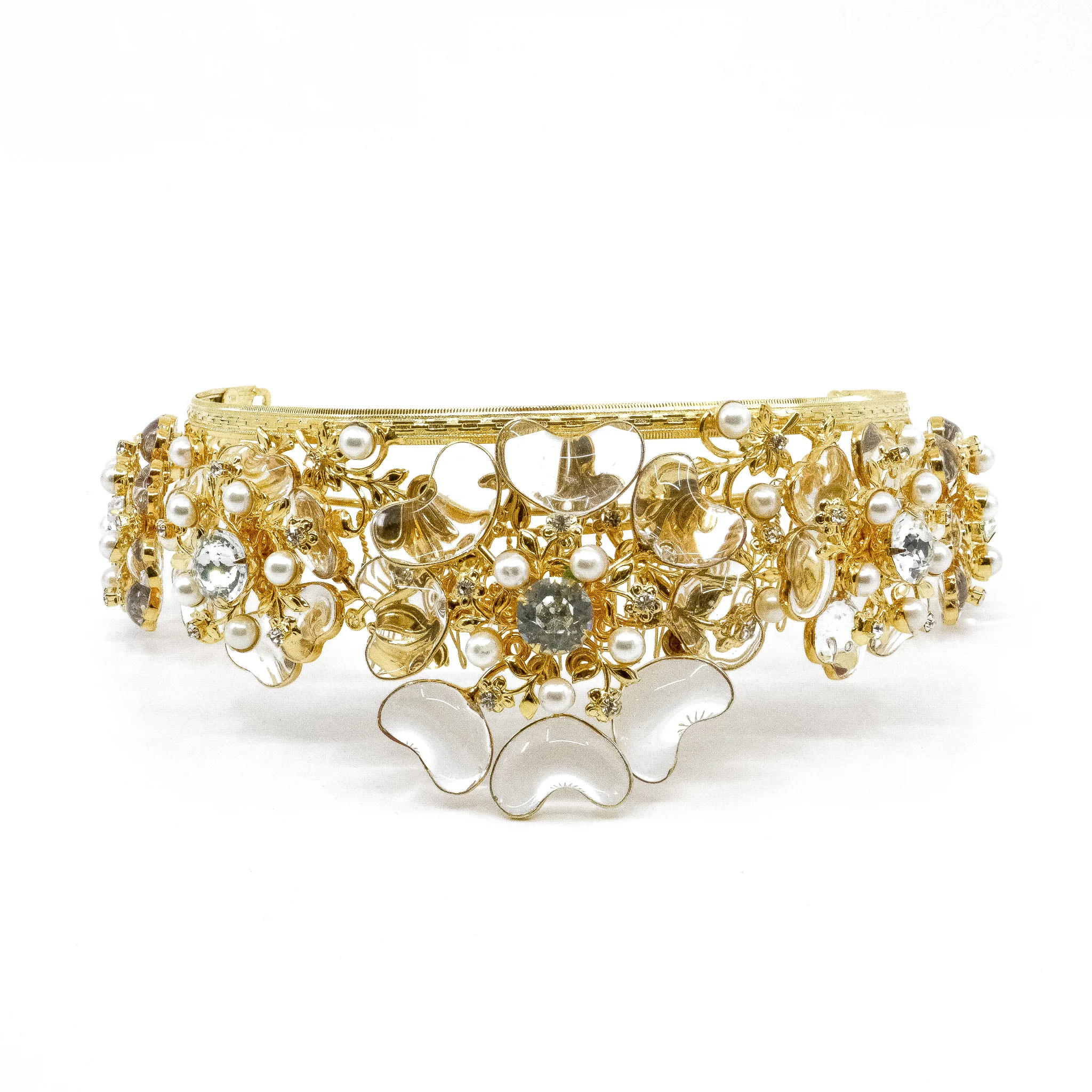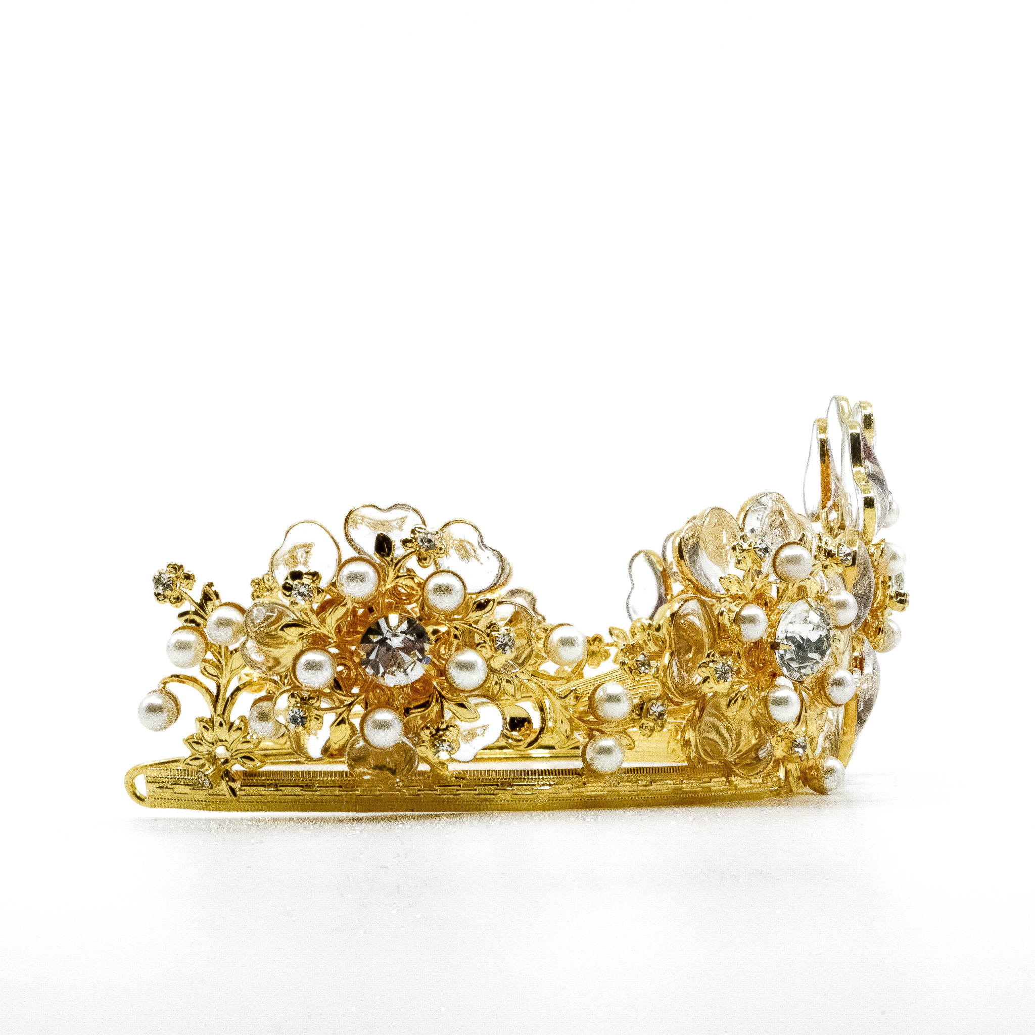 This is an absolute masterpiece of a headpiece by Moans Couture! From the bridal collection, the most delicate and fairytale-like tiara adorned with floral see-through crystal motifs, complemented by golden alloy hues.