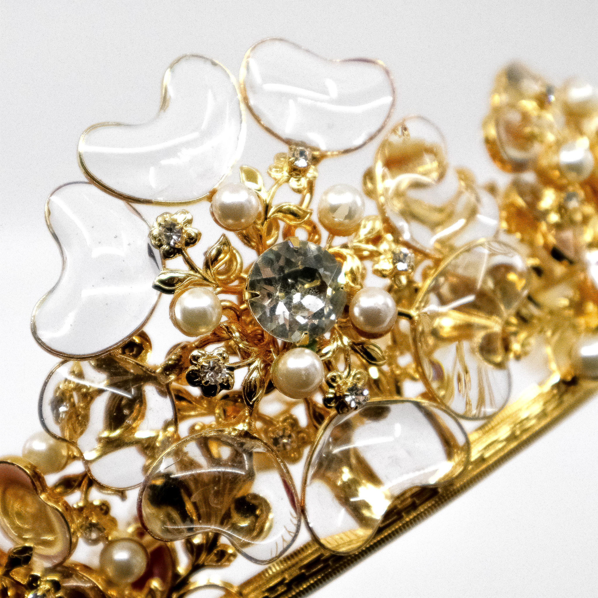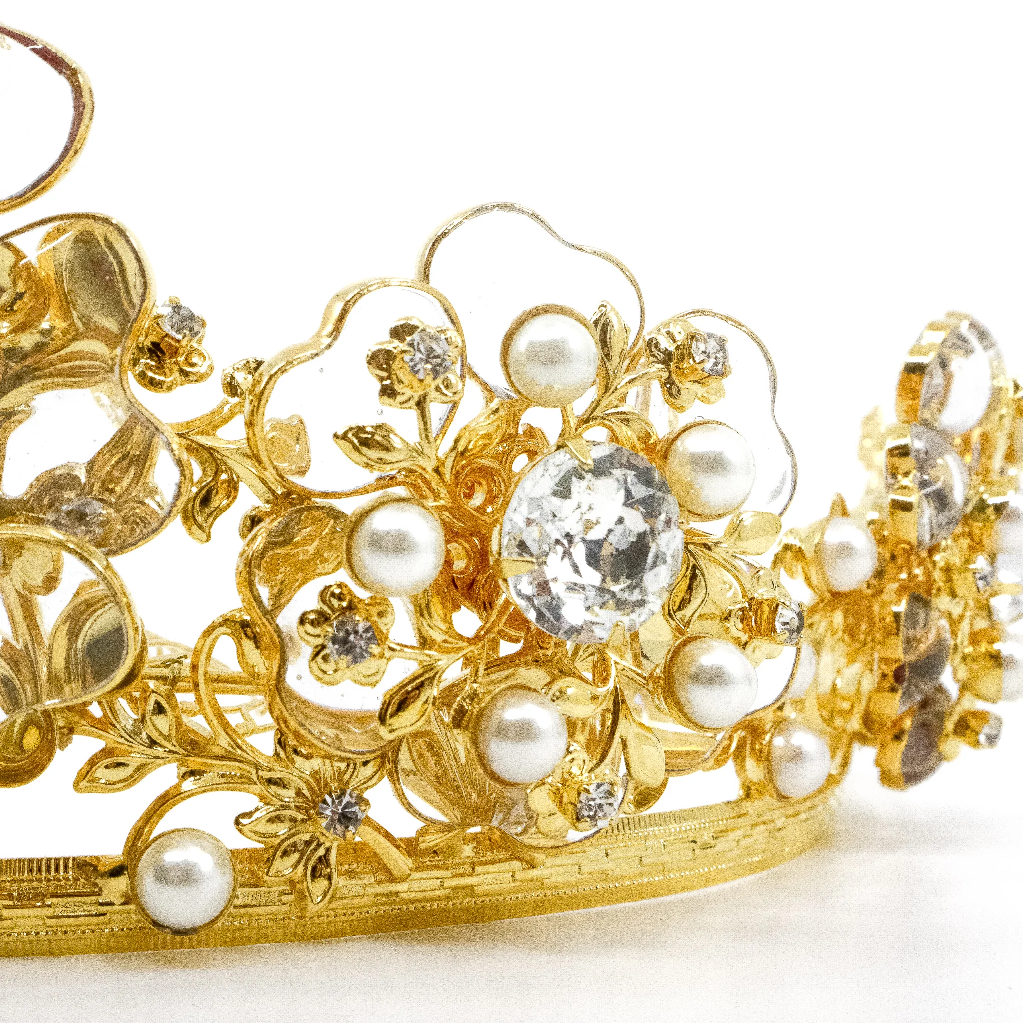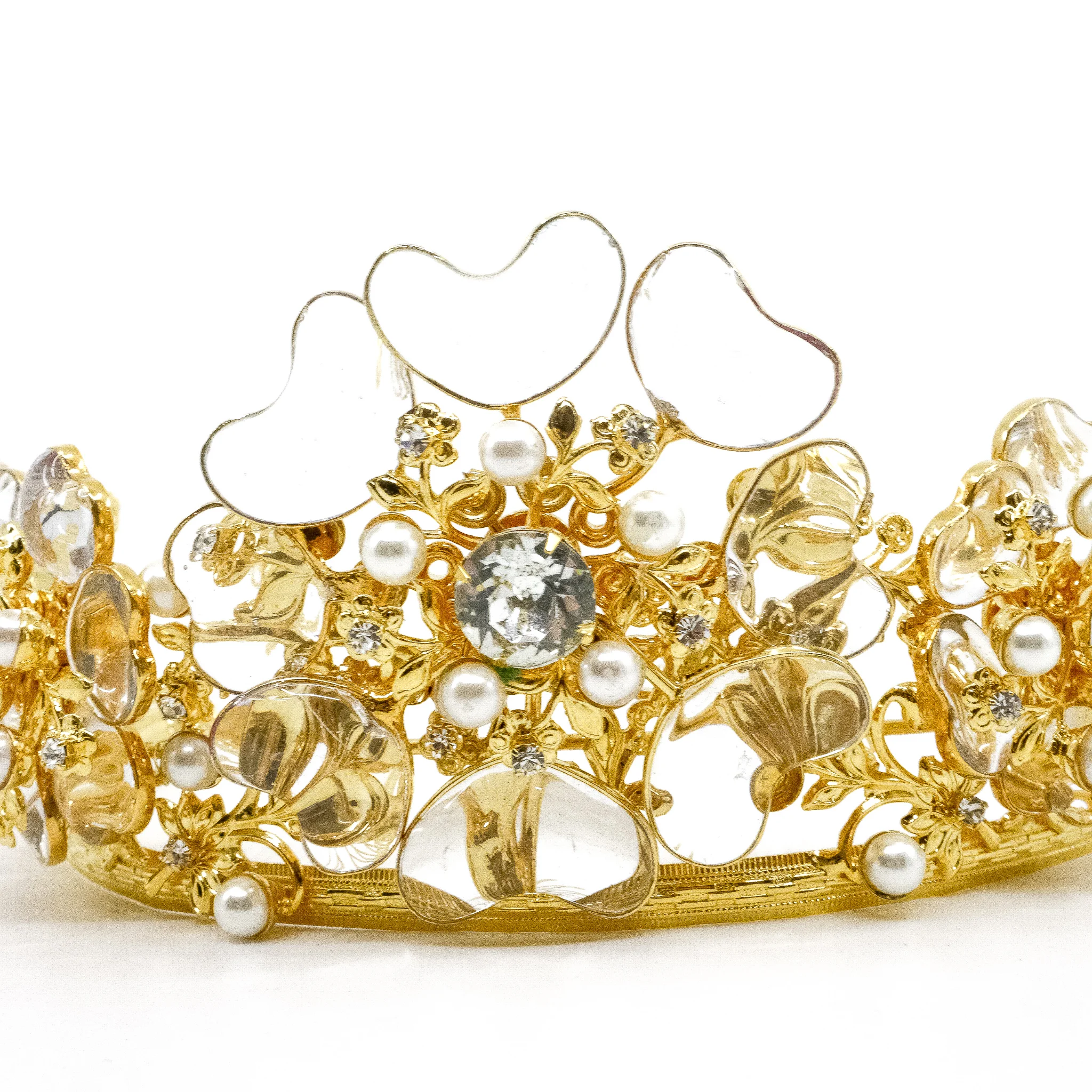 This is an absolute masterpiece of a headpiece by Moans Couture! From the bridal collection, the most delicate and fairytale-like tiara adorned with floral see-through crystal motifs, complemented by golden alloy hues.