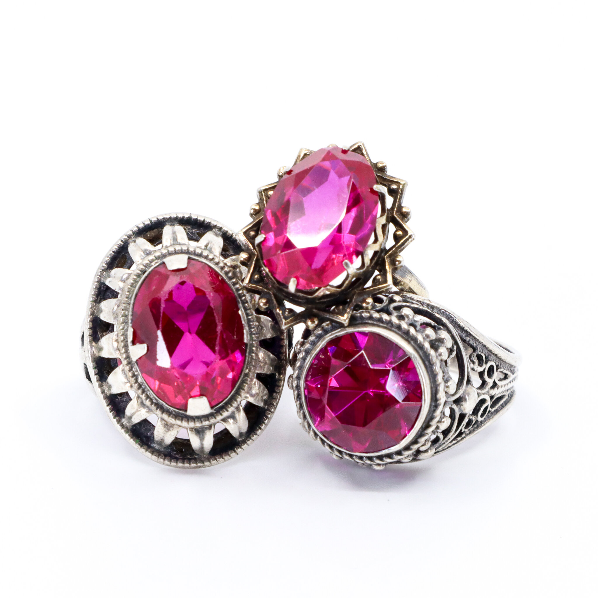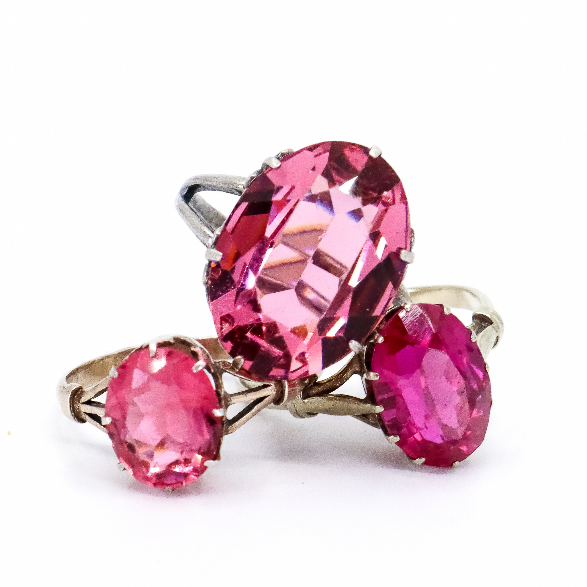 Vintage, Set of 3, Glass and Corundum Silver Rings in Pink