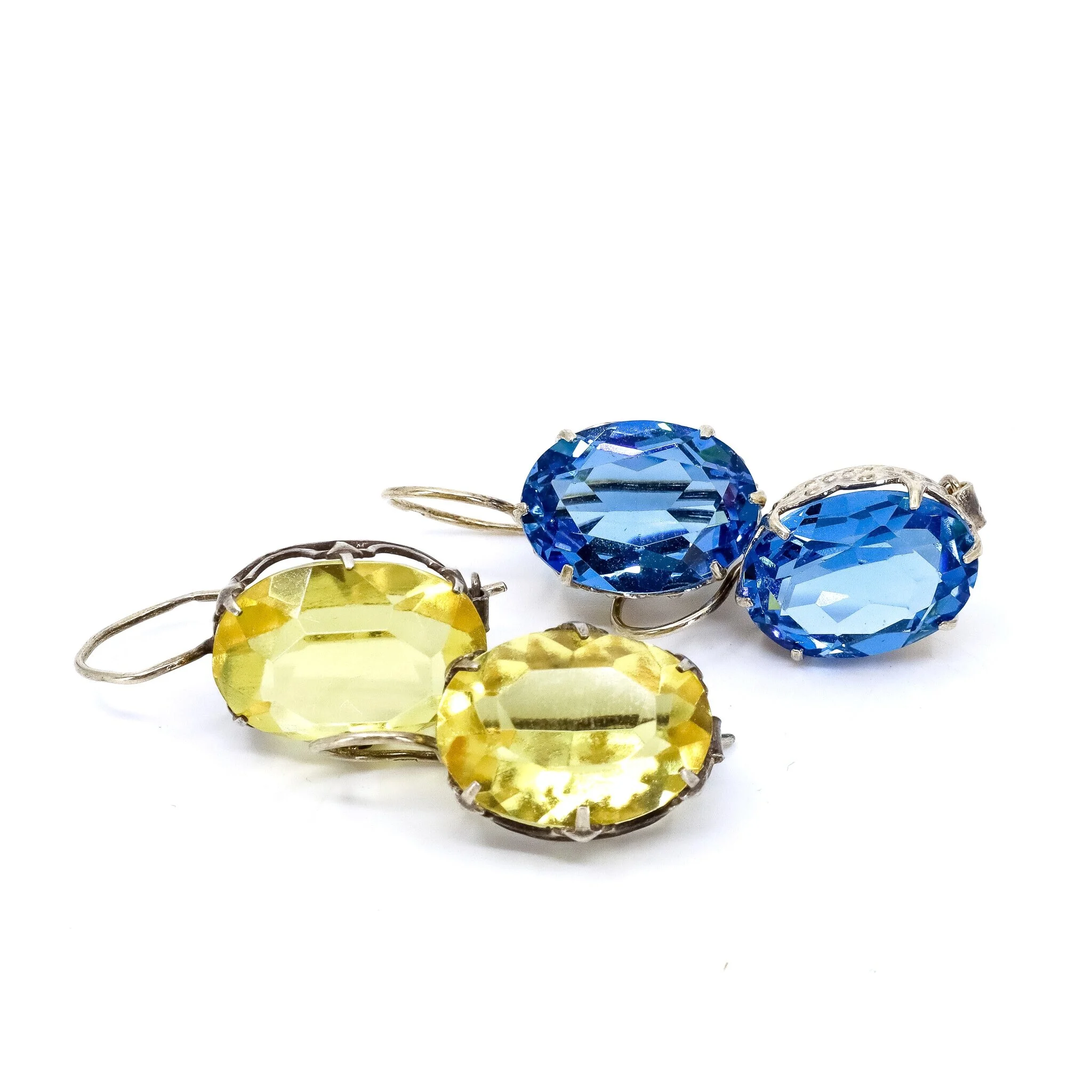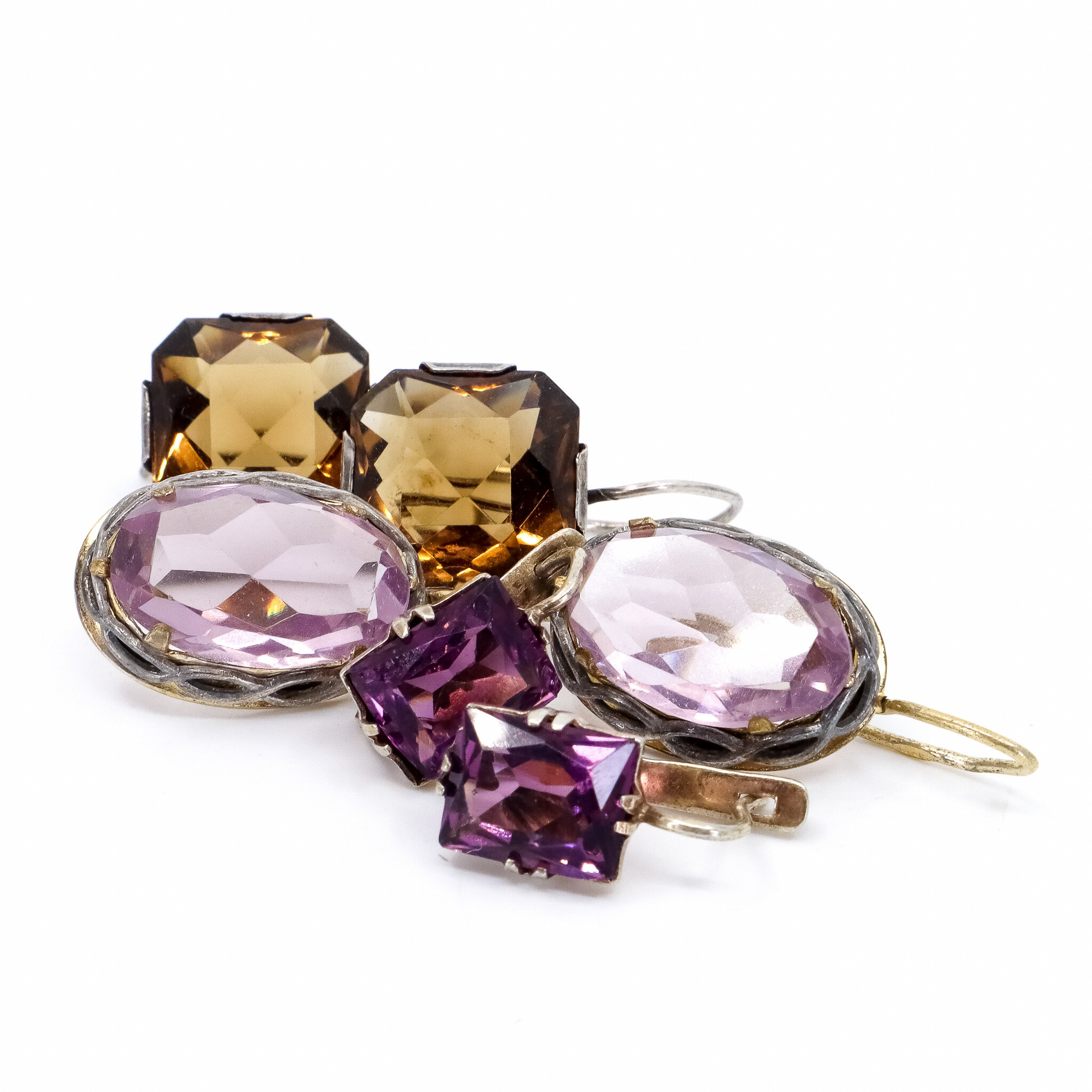 Vintage, Set of 2, Corundum Earrings and Brooch in Gilded Silver